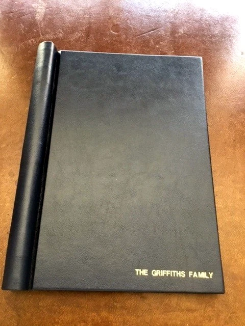 The presentation will be in a leather effect spring back binder, with a title of your choice, in hot foil blocking. The spring back binder will give you the option of adding photographs and personal memorabilia if you wish.